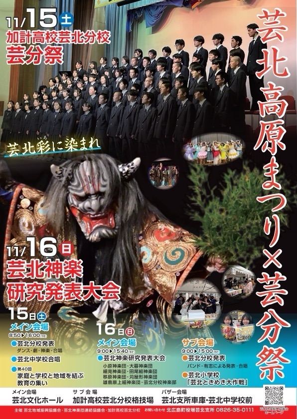 いよいよ明日から2日間「芸北高原まつり✖️芸分祭〜芸北彩に染まれ〜」を開催します。 15日は、芸北分校文化祭をメインに、文化祭終了後、第40回家庭と学校と地域を結ぶ教育の集いを開催します。 16日は芸北神楽研究発表大会を…
